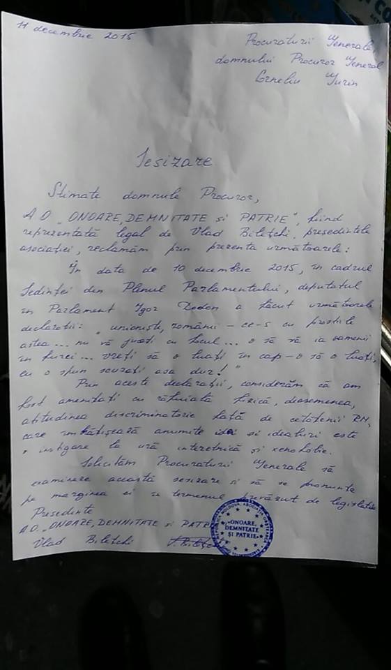 Astfel, socialiștii Igor Dodon și Vlad Bătrâncea sunt acuzați de instigare la ură interetnică, amenințare cu răfuiala fizică, precum și de xenofobie. „Nu rămânem indiferenți față de declarațiile revoltătoare ale lui Igor Dodon, iar gestul de a rupe Harta României Mari în plenul Parlamentului reprezintă o lipsă de cultură și respect față de cetățeni”, a precizat Vlad Bilețchi, președintele Asociației „Onoare, Demnitate și Patrie” (ODIP).
