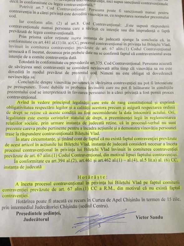 Liderul protestelor din noiembrie 2016 mai spune că este dezamăgit de felul cum autorităţile au tratat acest caz, întrucât timp de un an a fost purtat în zadar prin instanţe. „Este o victorie pentru noi, dar în acelaşi timp şi o demonstrare a faptului că avem o justiţie selectivă, care acţionează doar atunci când devii incomod pentru sistem. În noiembrie 2016, mii de oameni au ieşit în stradă pentru a protesta împotriva alegerilor fraudate şi împotriva lui Igor Dodon. Mai multe portaluri de ştiri, ziare, radiouri şi televiziuni au mediatizat pe plan international protestul din Chişinău. Ne-am exprimat nemulţumirea şi dezacordul, iar pentru asta au hotărât să ne judece şi să ne amendeze”, a mai precizat Bileţchi.