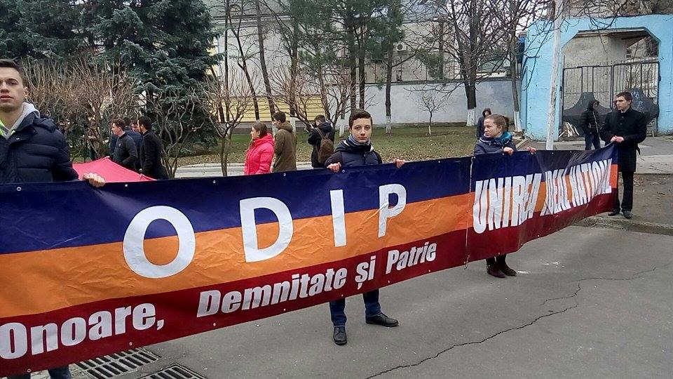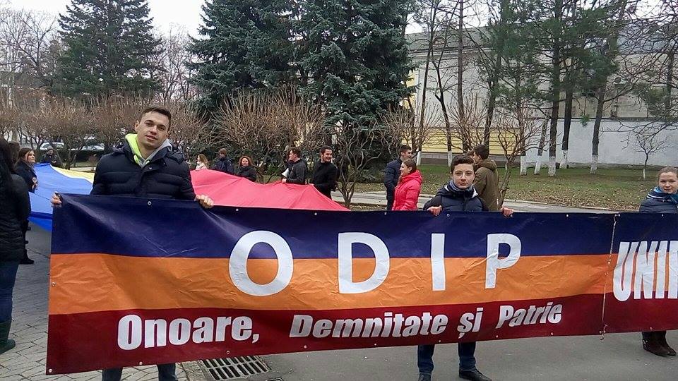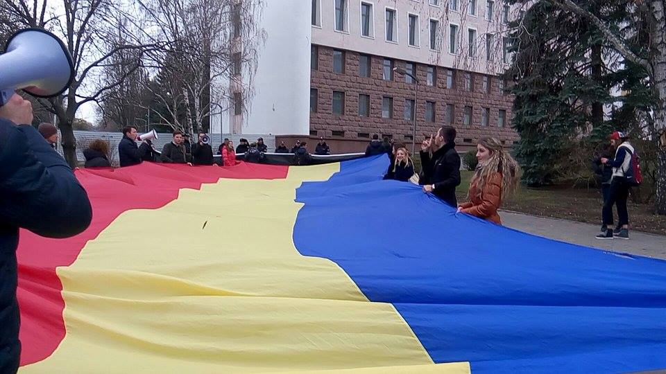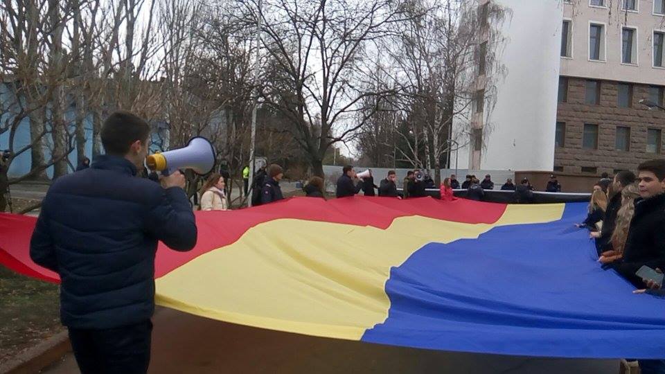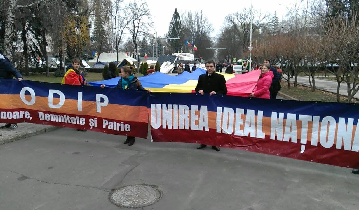 Tinerii au întins un tricolor imens de 15 metri lungime şi au afişat pancarte cu mesajul „Unirea – Ideal Naţional” şi au protestat astfel contra declaraţiilor lui Igor Dodon, care a ameninţat cu răfuiala fizică. Participanţii au scandat slogane precum: „Harta României e a noastră, puşcăria-i casa voastră”.