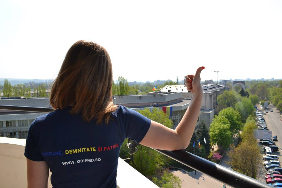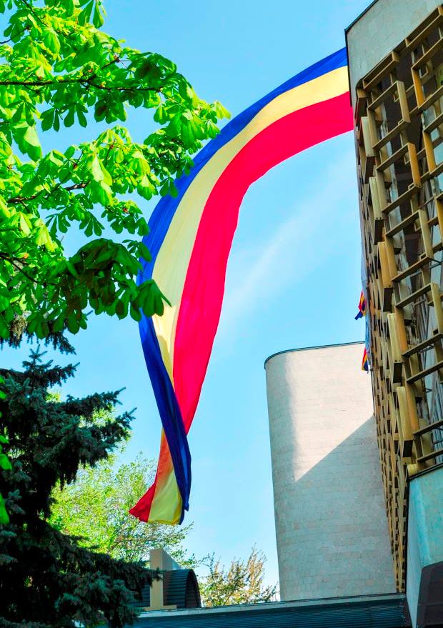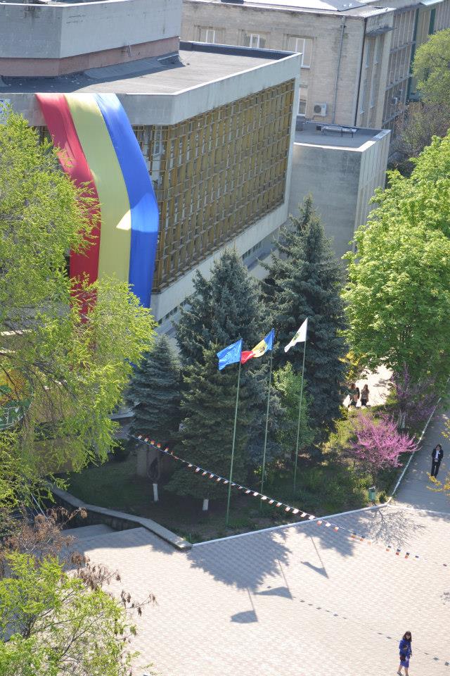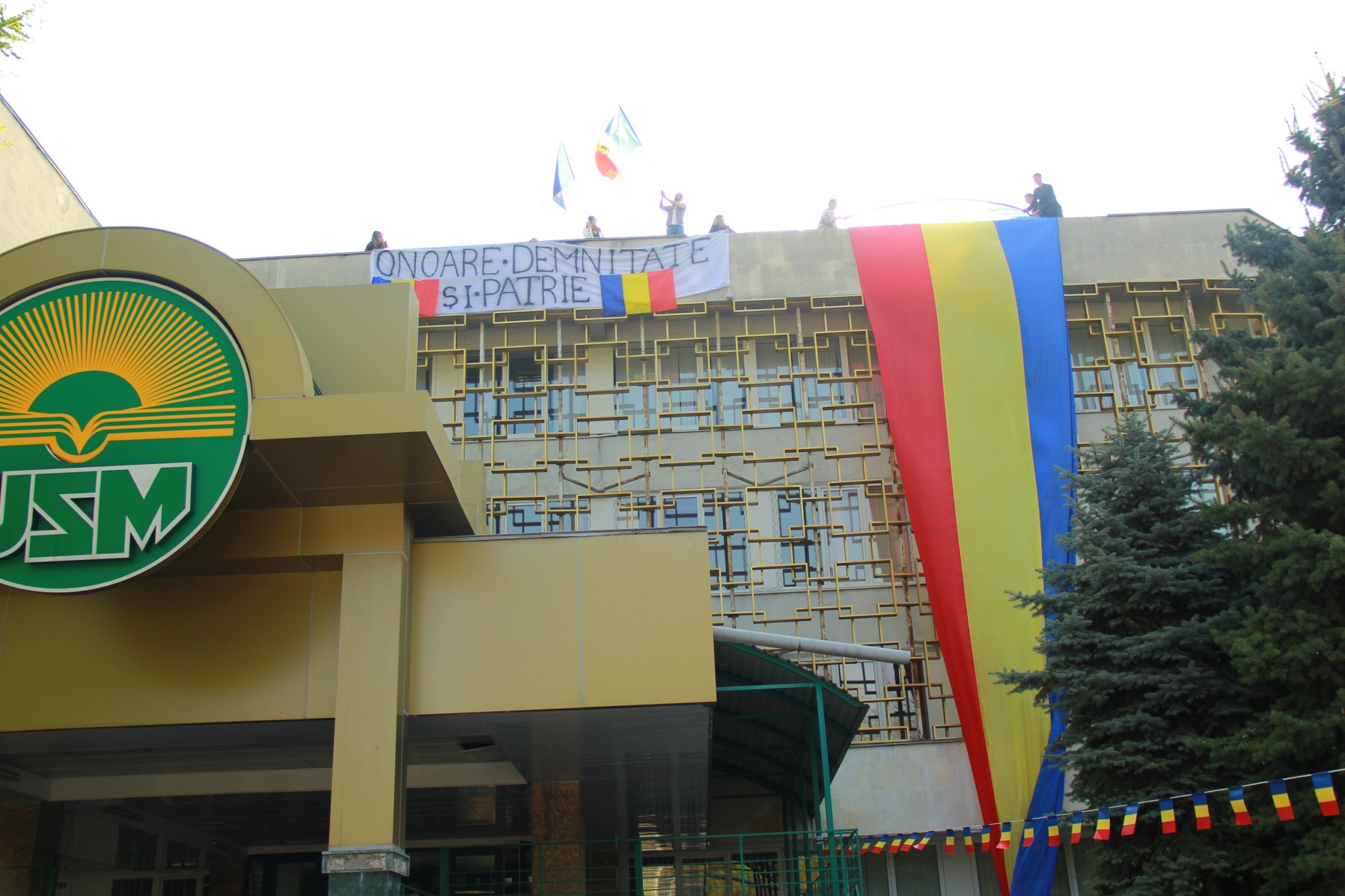 Un drapel imens de 15 metri lungime a fost desfășurat astăzi pe blocul central de studii al Universității de Stat din Moldova. Evenimentul a fost organizat de Platforma Civică Onoare, Demnitate și Patrie, care a dorit să marcheze inedit cei 25 de ani de la proclamarea tricolorului ca drapel de stat.